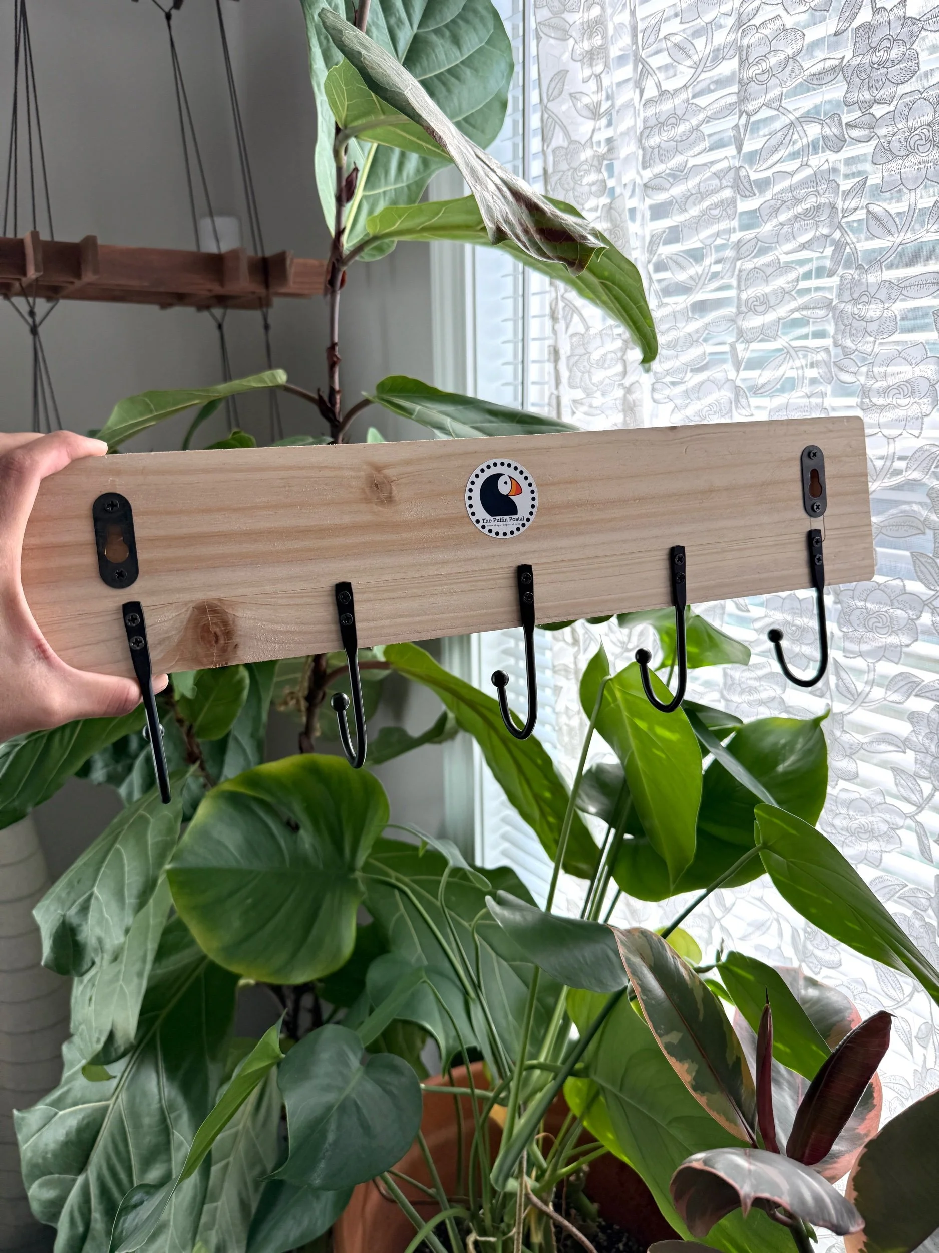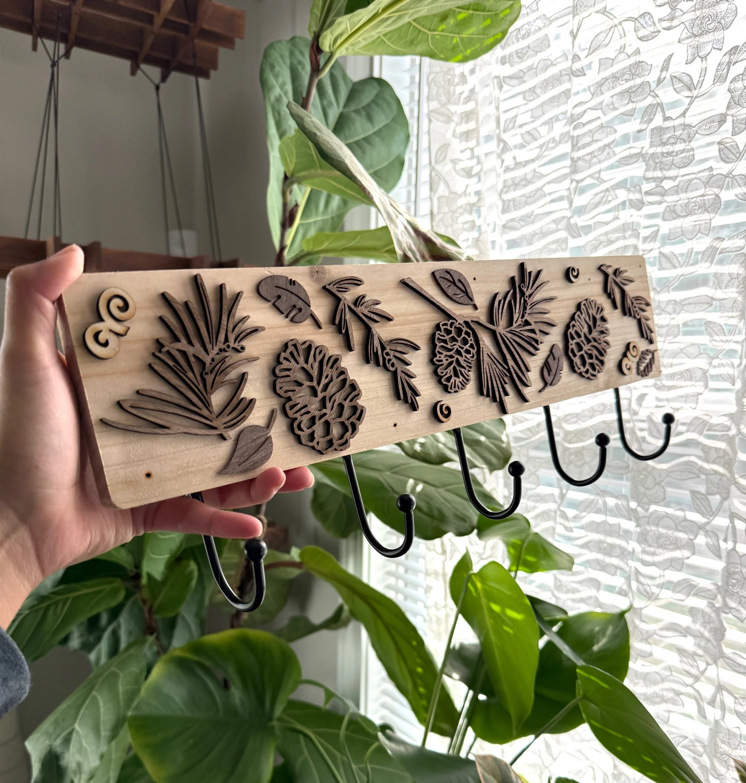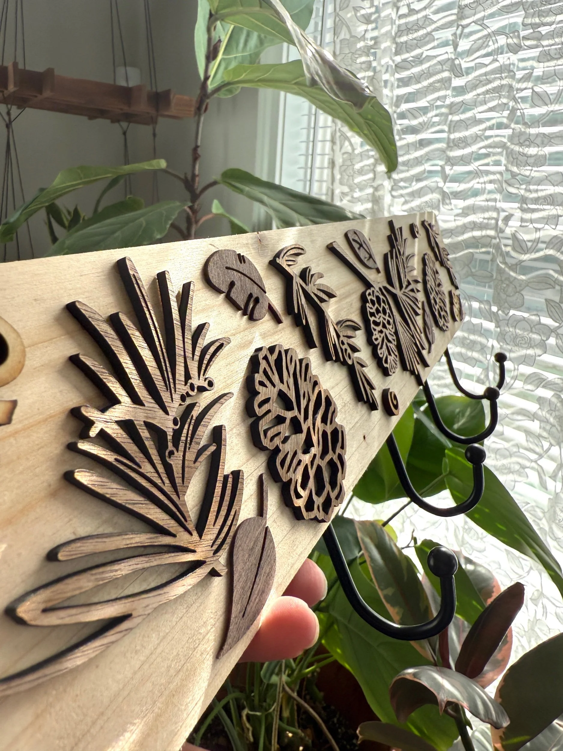 My drawings turned into wooden appliqués are sprinkled on to this pine plank and is perfect for a corner that needs a little practical help and warmth :) It’s 18” long and great for any space!